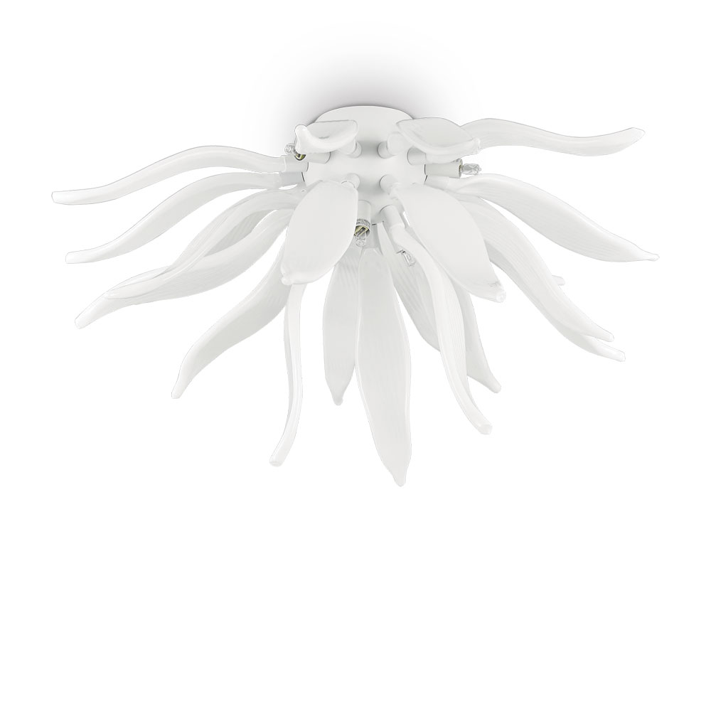 Deckenleuchte mit Gestell aus Metall. Dekoelemente aus geblasenem Glas handmodelliert. Pendelleuchten mit Stahlkabeln höhenverstellbar. Erhältlich mit Gestell und Gläser in weiß.
