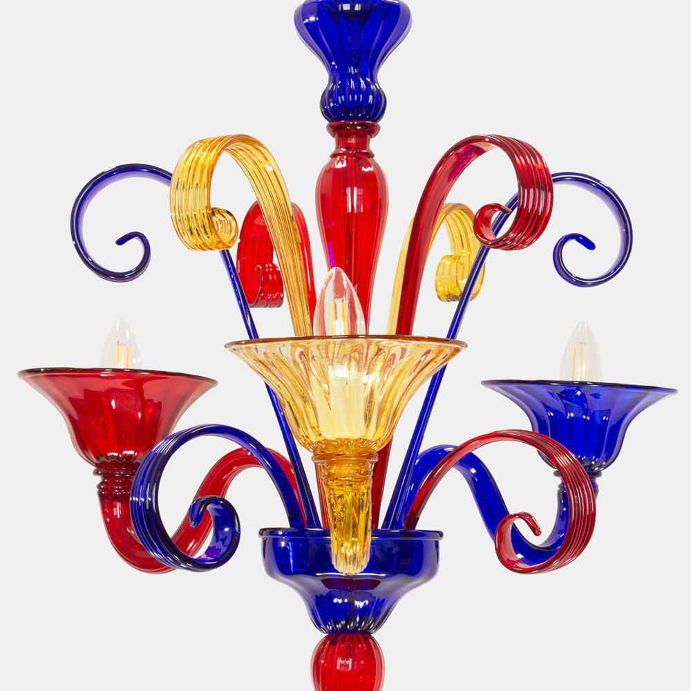 Dieser Kronleuchter ist aus grünem, rotem, blauem und amber Glas gefertigt. Auf Anfrage kann dieser Leuchter auch monochrom oder anders farbigem Glas gefertigt werden.