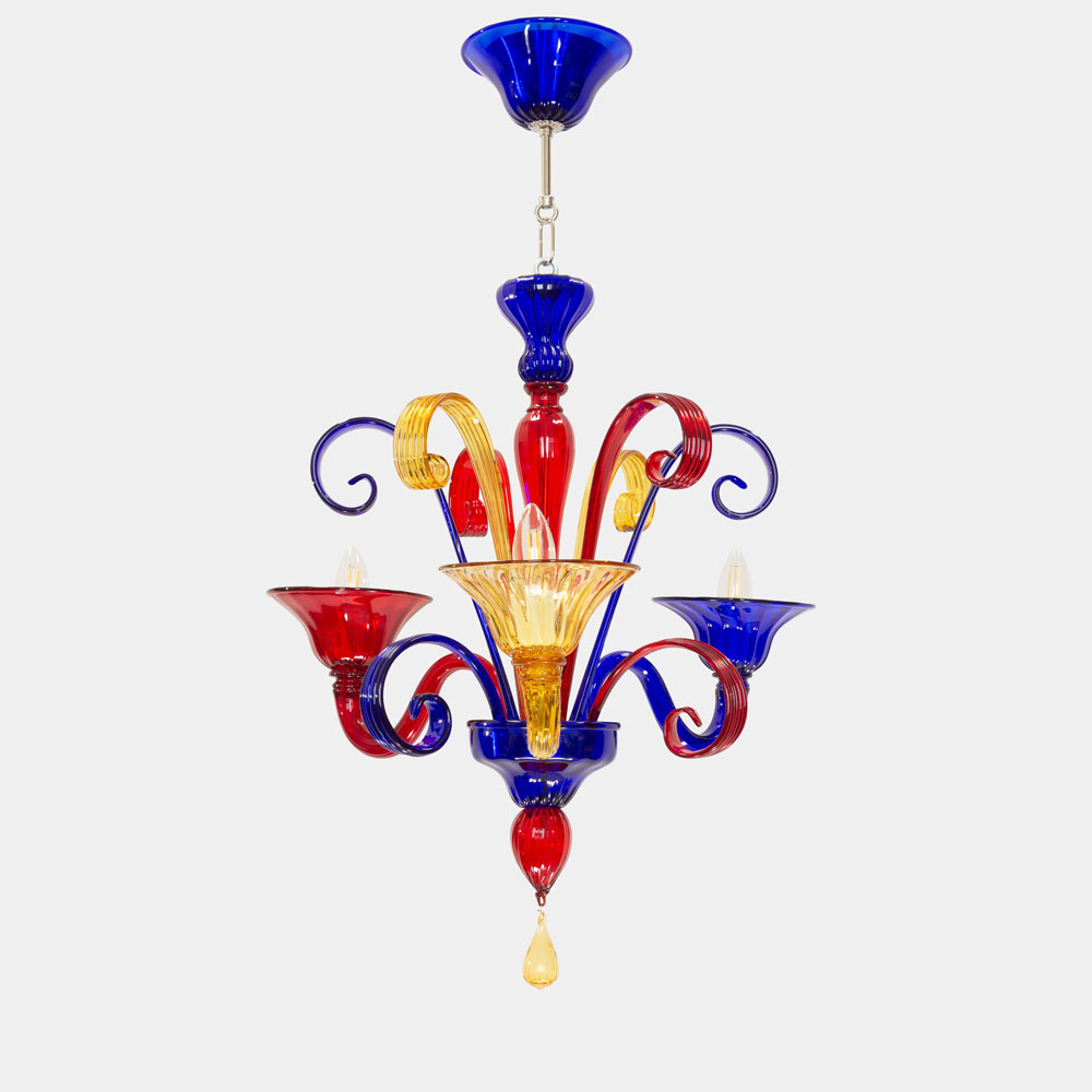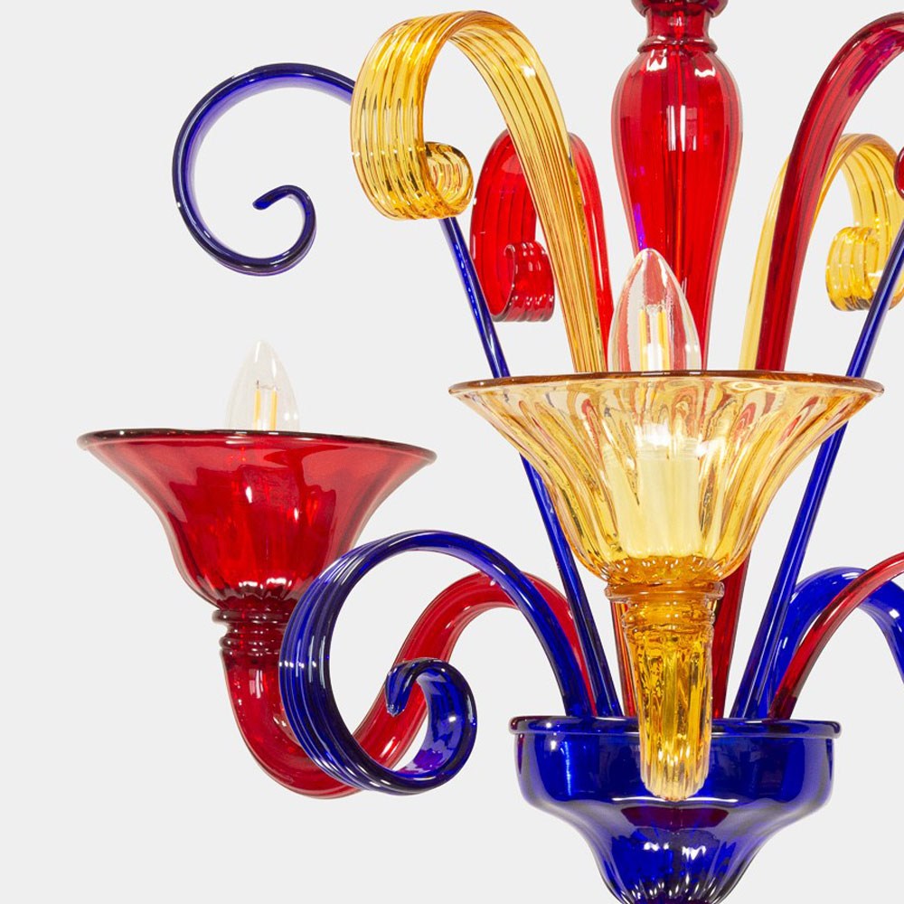 Dieser Original Murano - Kronleuchter wird ausschließlich aus farbigem Glas hergestellt und von Hand gearbeitet, nach der alten Kunst der Murano-Glas Meister. Jeder Kronleuchter kann in der Größe, durch die Wahl der Farbe und Anzahl der Lichter individuell angepasst werden. Die Metallteile sind verchromt, können auf Wunsch auch in Gold gefertigt werden.