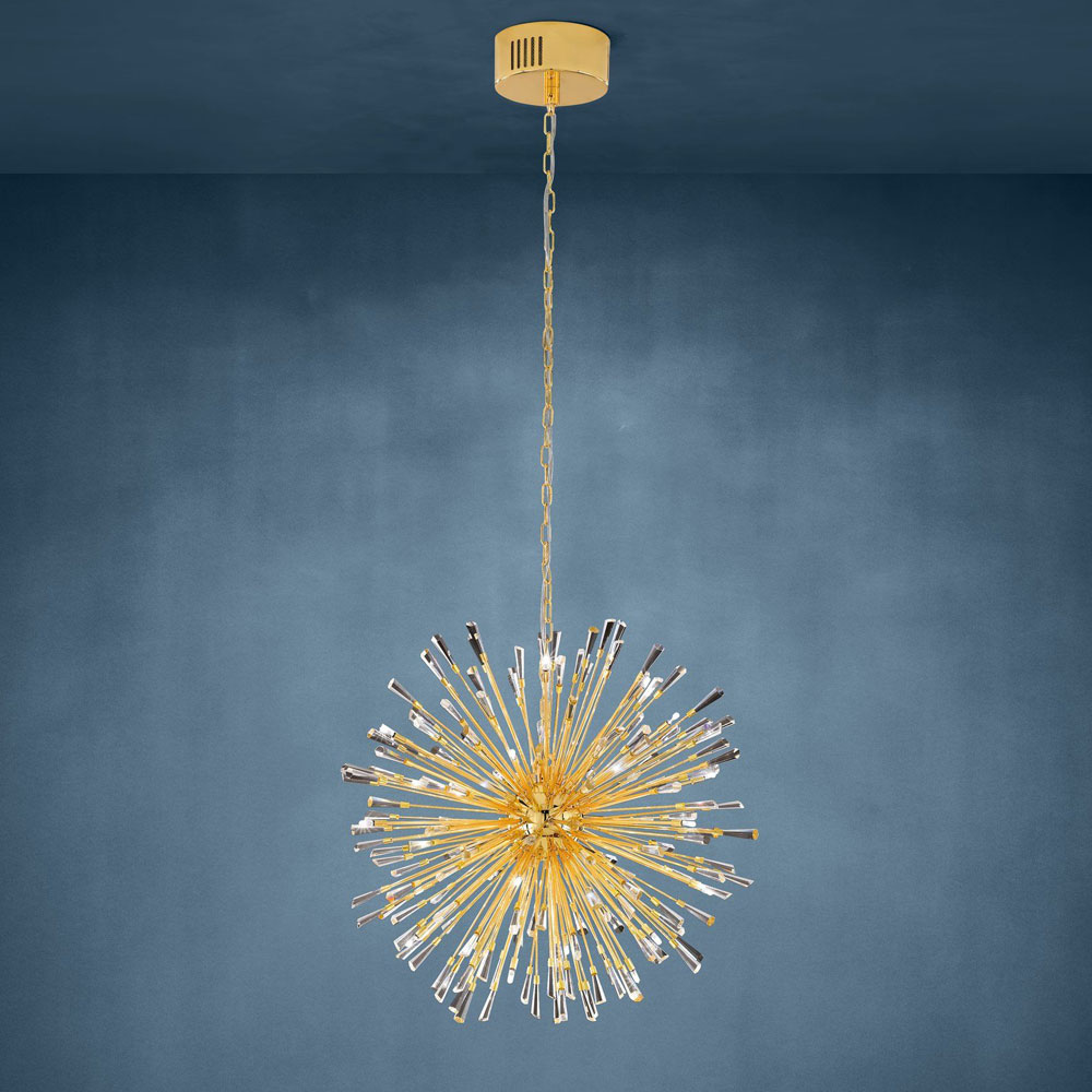 This LED pendant light is made from a gold-plated metal sphere with a large number of gold-plated metal rods attached all around it. At the ends of the long metal rods are clear brilliant glass elements through which the warm white light of the internal G4 LED lamps shines. The arrangement of the metal rods at the base creates a large, spherical luminaire body, which is suspended from a canopy of the same color using a gold-plated link chain. The special design of the light in combination with the high-quality, clear brilliant glass ensures a sparkling and elegant appearance. The pendant lamp blends elegantly into a modern living style and provides extravagant lighting for any room - whether in the living room or in the dining room above the dining table. The bulbs are included in the scope of delivery.