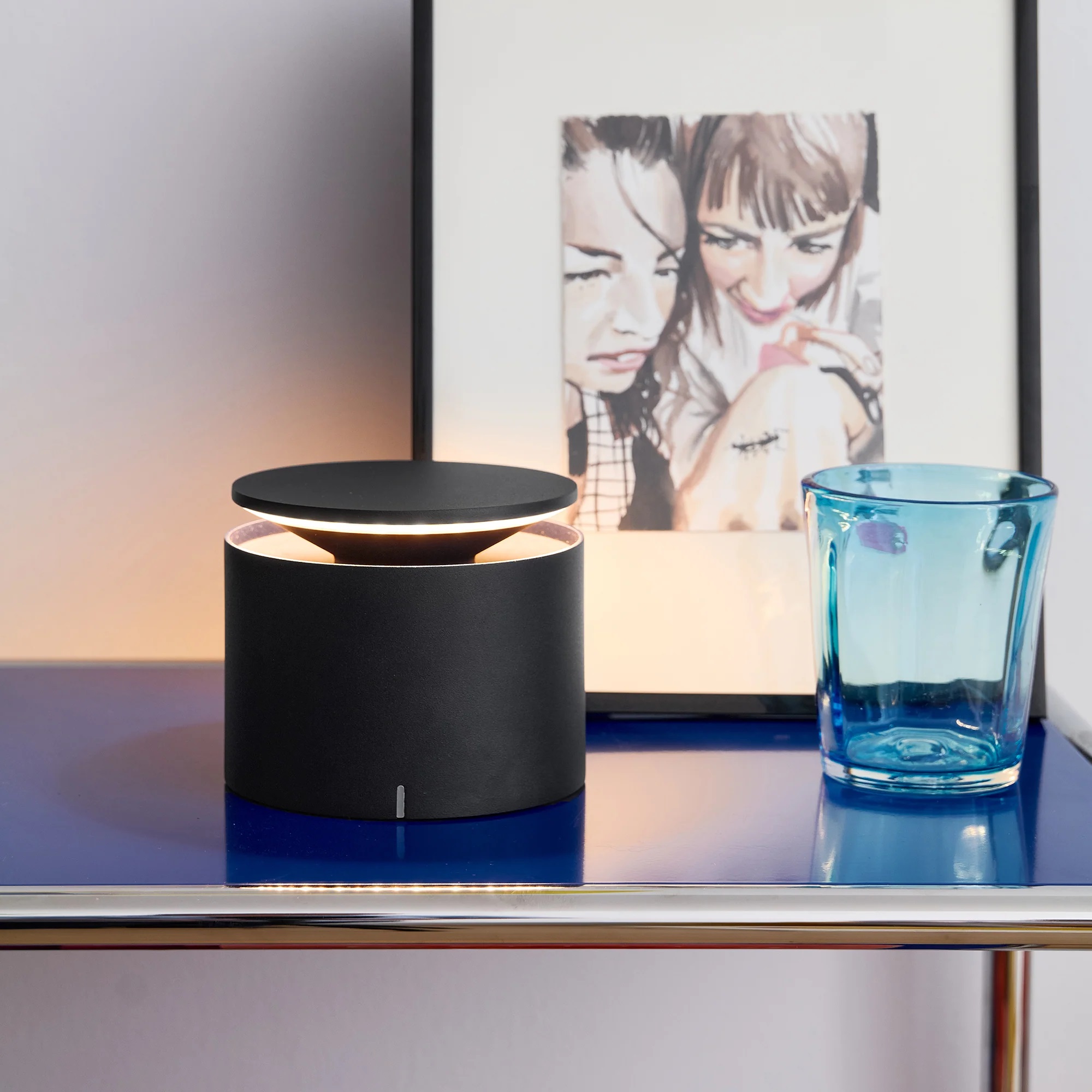 Cordless, rechargeable, battery table lamp. When you press on the top of the lamp, it lifts up and the light comes on. To turn it off, you simply need to press it down again. Under the base there is a touch control that when the top of the lamp is up, allows you to switch the light on, adjust its intensity and select its color temperature. And thanks to its high IP rating, the lamp can also be used outdoors. An electronic control system monitors and indicates the remaining battery power to ensure recharging is optimized and always performed correctly. The lamp comes with a contact charging base. Battery charger not included.